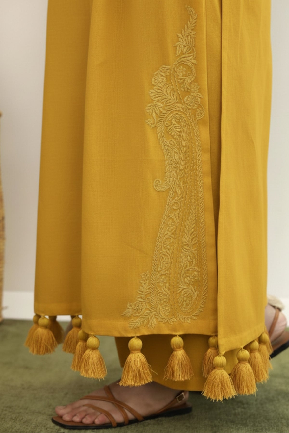 The warm golden tones reflect luxury and refinement, making this suit an ideal choice for festive gatherings, formal events, and special occasions. The intricate embroidery adds depth and texture, while the tassels provide a trendy, modern finish.