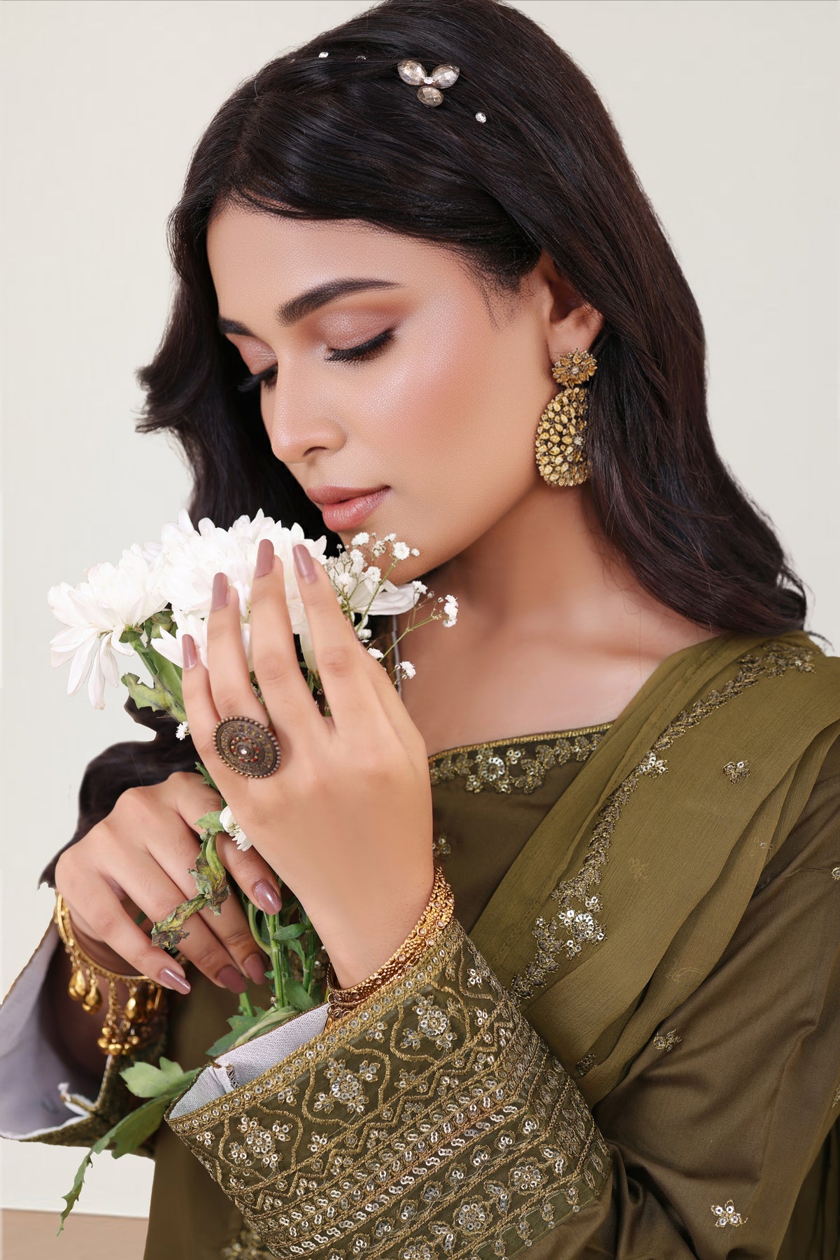 Introducing Green Punkh, a masterpiece from the Shab-e-Zehra Collection. This 3-piece embroidered Dhank suit features a richly textured shirt with intricate detailing, matching trousers, and a lightweight chiffon dupatta with fine embroidery.